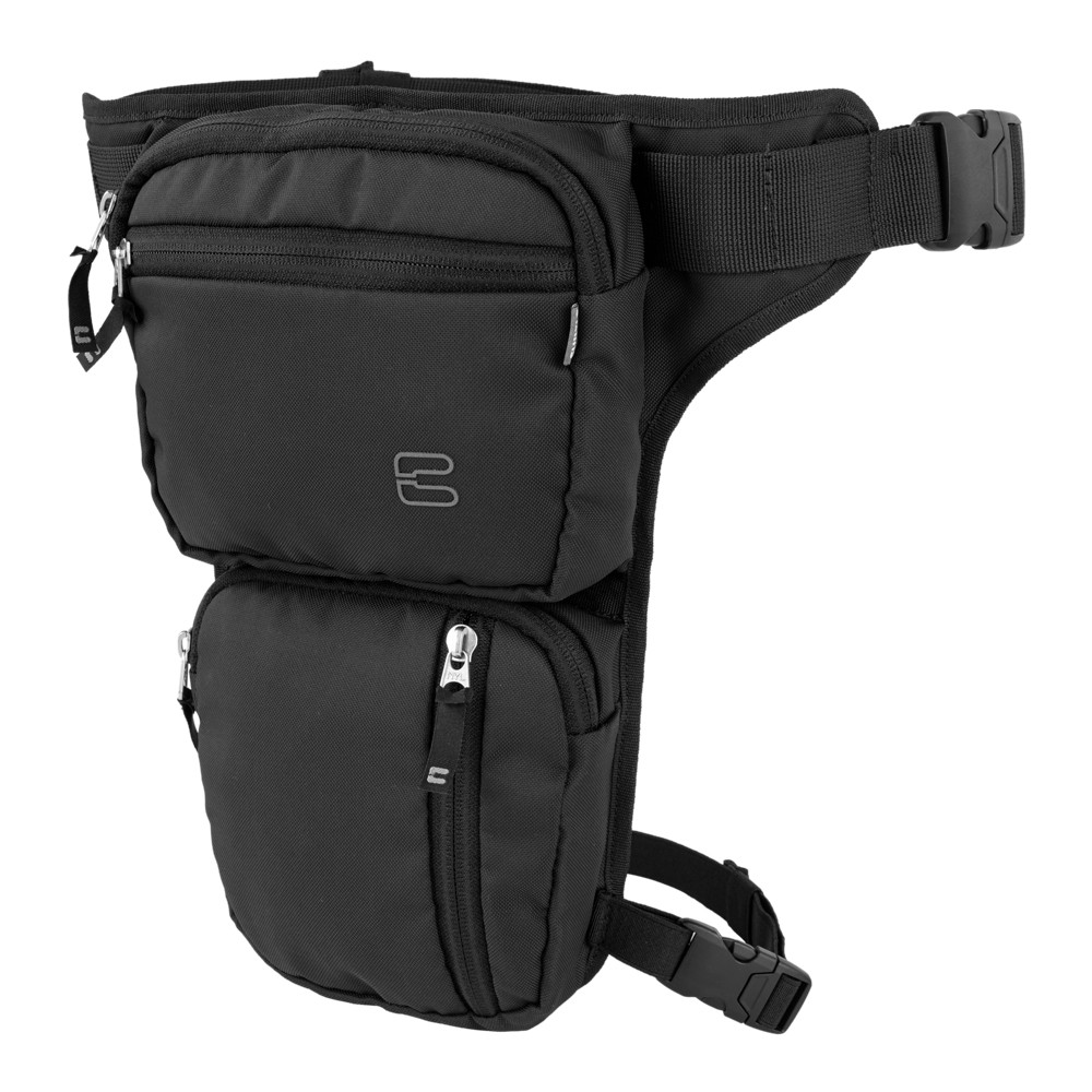 Resistente à água, com dois compartimentos individuais e dois pontos de fixação: na cintura e na coxa. Possui bolso acolchoado para celular, porta-chaves, bolso superior frontal de fácil acesso e inferior com abertura vertical. Ideal para motociclistas, e uso diário.